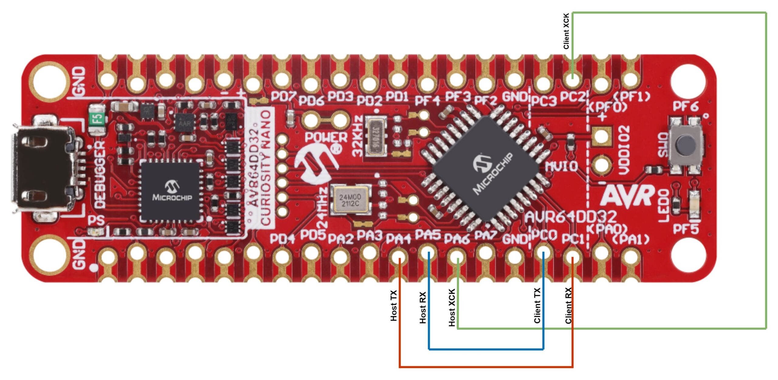 This project shows how to use Synchronous mode for the USART peripheral by connecting two instances and making them communicate with each other. In Synchronous mode, the XCK pin is required. The instance that acts as host provides the clock on the XCK pin and the client instance receives the clock on the XCK pin. This program sends the character H from one instance and the character C from the other, repeatedly.