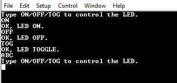 Note: Open the terminal before programming the device. The help command Type ON/OFF/TOG to control the LED. will be received.
