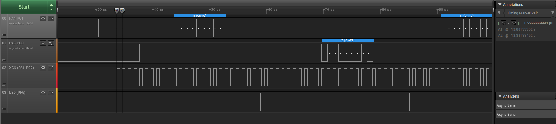 The character H is transmitted by USART0 and received by USART1. Then C is transmitted by USART1 and received by USART0.