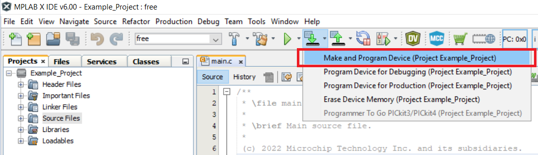 Open the Example_Project.X project in MPLAB® X IDE