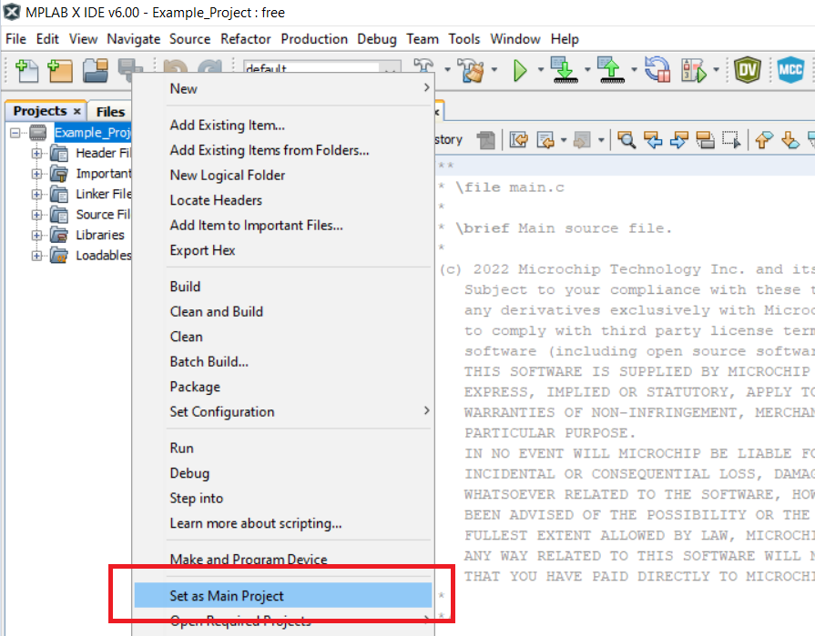 Set the Example_Project.X project as main project