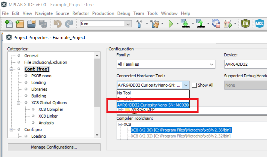 Select AVRxxxxx Curiosity Nano in the Connected Hardware Tool section of the project settings: