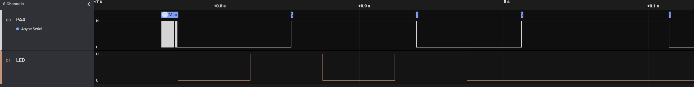 The image below shows the transmitting pin (PA4) together with the LED (PF5) after an error on the communication line (PA4) occured. The LED toggles every 50 ms, signaling the error.